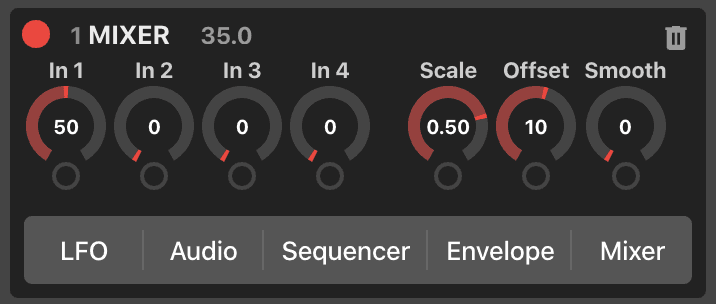 The mixer modulator is a very powerful modulator that allows you to mix multiple outputs from a maximum of 4 other modulators or MIDI knobs and lets you output it as one. On top of that you can apply a scale, offset and also smoothing.